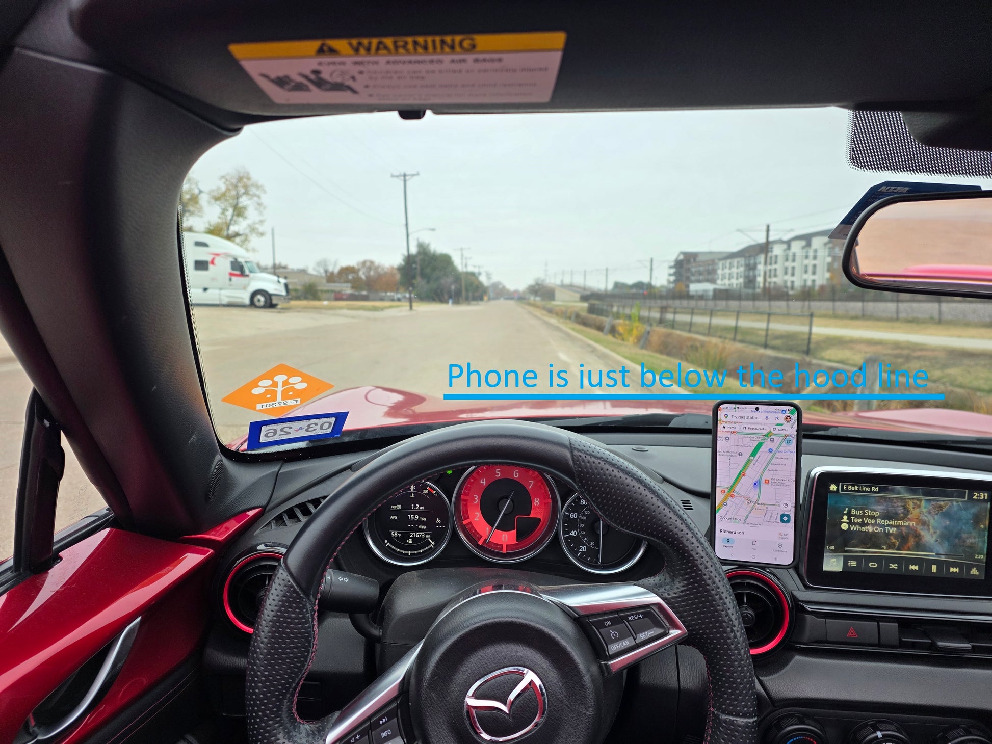 - Perfectly position your phone: put your navigation just off your line of site so that you can look at it without taking your eyes off the road. Your phone’s position is still within the hood line, so your line of site to the road is not obstructed.