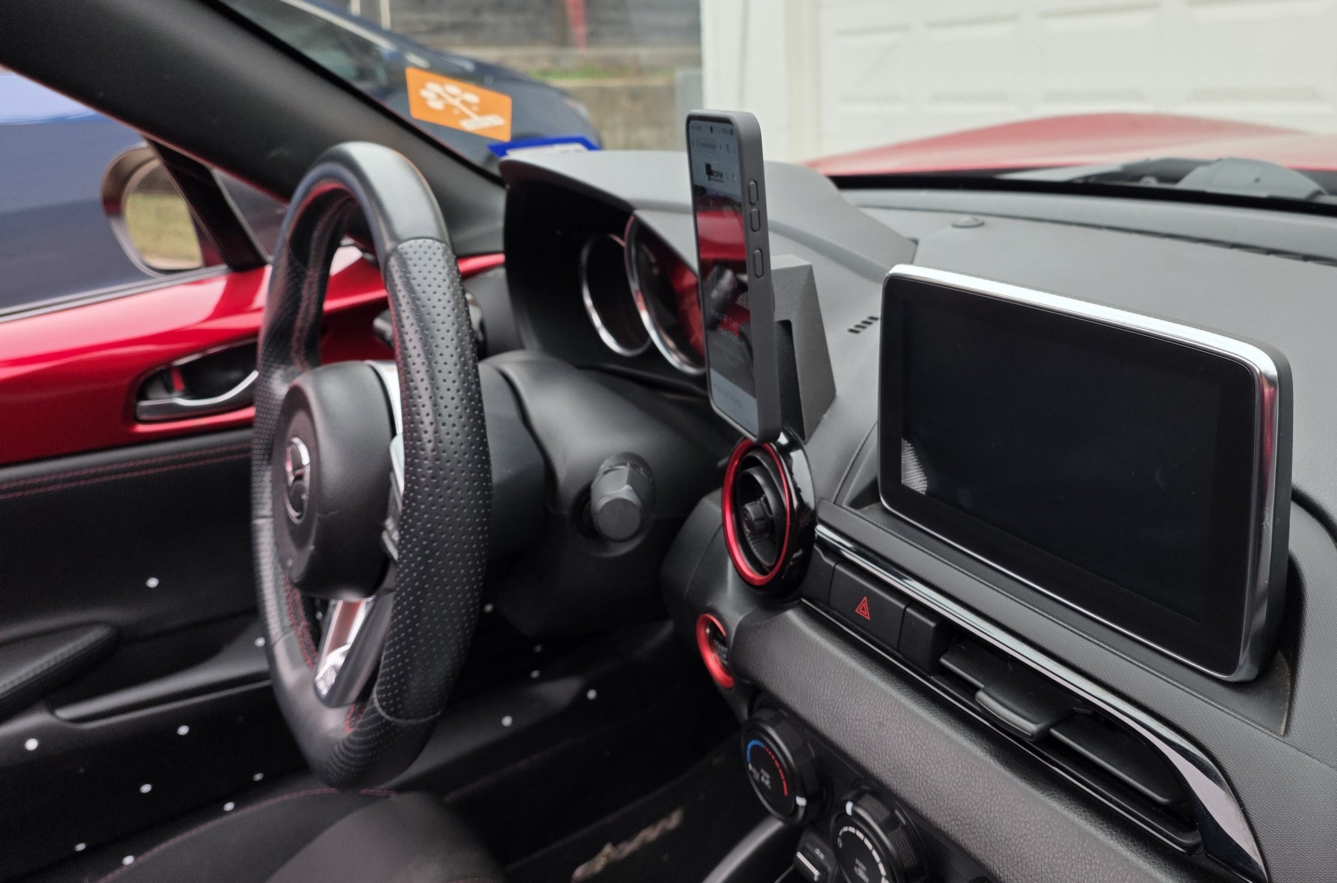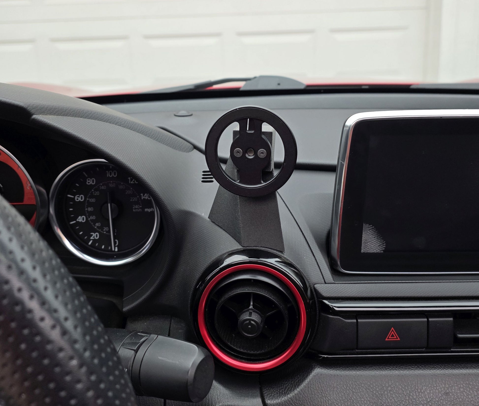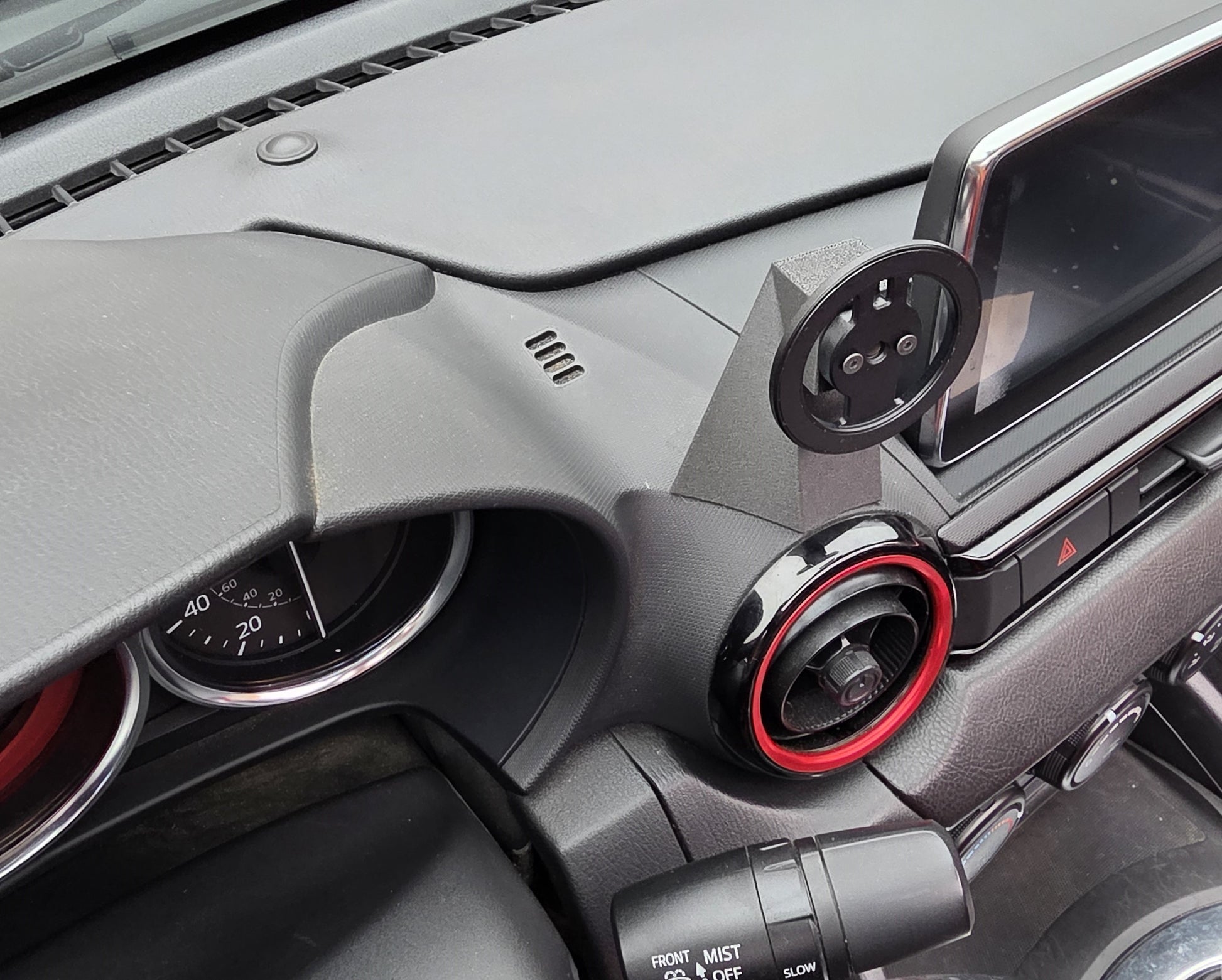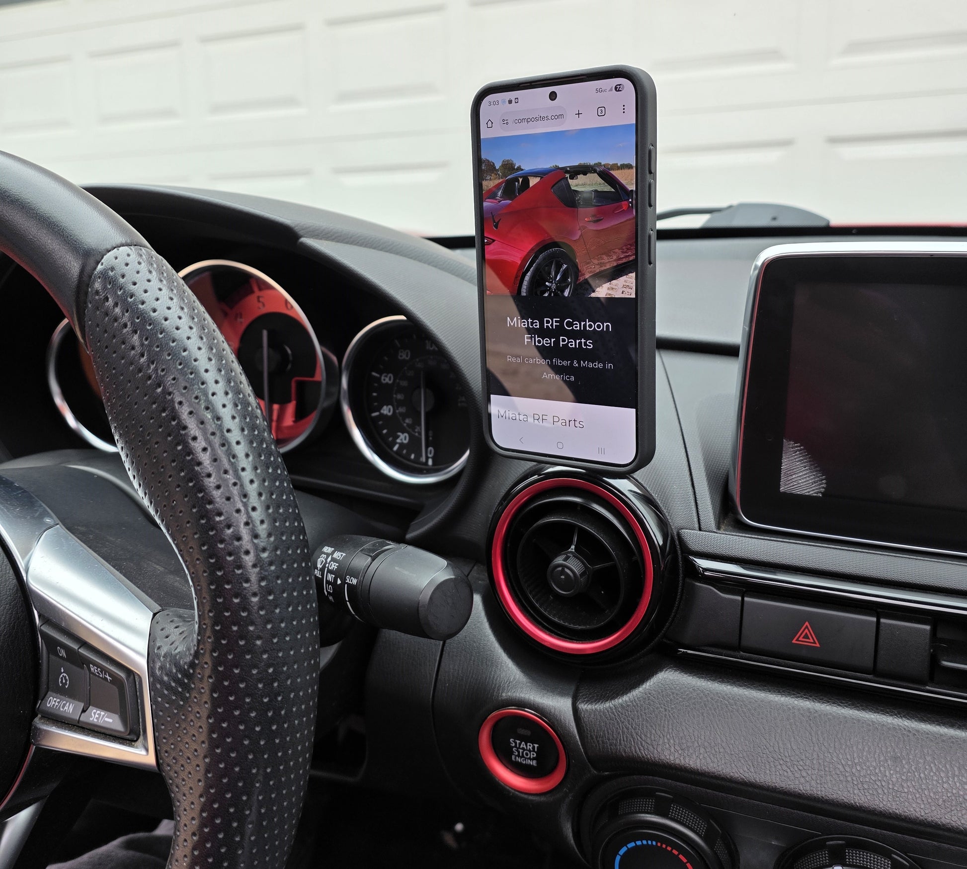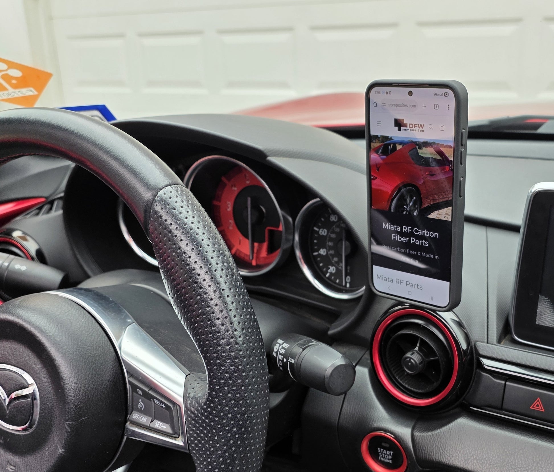 The DFWcomposites’ MagStand for the Miata ND is designed to be the most stable and useable mount for your ND. We started by 3D scanning the dashboard’s geometry, and then artfully designed an attractive mount that is perfectly situated and looks like it was an OEM part of the dashboard thanks to its flowing shape that blends into the Miata’s dashboard’s design lines.